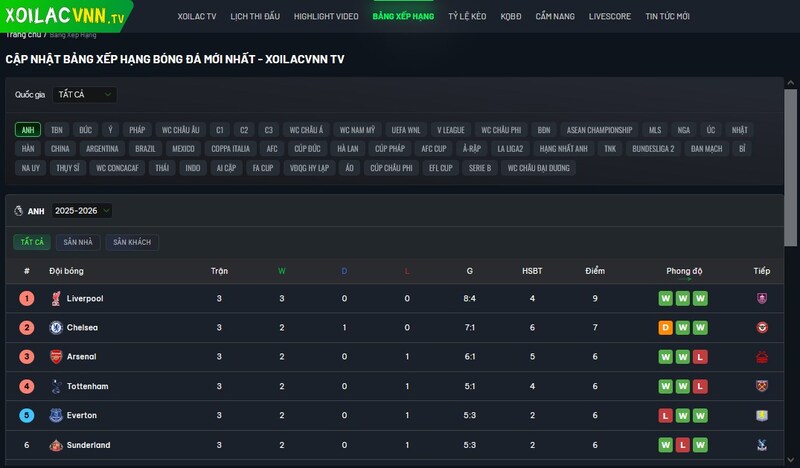 - Cập nhật bảng xếp hạng bóng đá a n h và các giải khác: Đây là điểm mà mình ấn tượng nhất. Anh em nào mê Premier League, Hạng Nhất Anh, Cúp FA sẽ thấy toàn bộ thông tin về điểm số, hiệu số, phong độ đội bóng được cập nhật liên tục, chính xác tuyệt đối.
